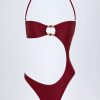 Master resort dressing. The perfect one-piece for beach club or beach days that turn into balmy evenings, this bandeau swimsuit is crafted from premium stretch-jersey swim fabric that sculpts and shapes your figure. It’s punctuated with a curved side cut-out and a small bust cut-out, anchored with hammered gold-tone hardware and delicate bead embellishments.