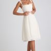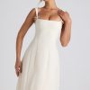 Channelling the essence of spring. Rendered in two crisp hues, the Isadora midi dress is cut from sculpting stretch woven fabric and underlaid with a contrasting pleated georgette skirt. The A-line silhouette is enhanced with shaping princess seams and framed with a Bardot neckline, complete with bow embellishments at each side. It’s finished with adjustable rouleau shoulder straps that tie at the back.