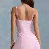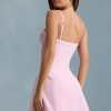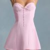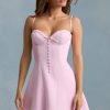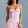 Soft romance. Crafted from stretch satin to a figure-enhancing A-line silhouette, the Avelora mini dress is the sweetest summer staple, elevated with decorative covered buttons, pintucked detailing, and scalloped trims. It features adjustable shoulder straps for your perfect fit and features a layered broderie anglaise hem.