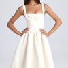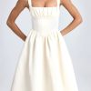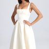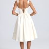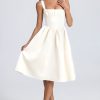 Timeless and romantic: meet the Marguerite midaxi dress. A whimsical silhouette, it’s crafted from lightweight lustrous satin with a fitted bodice that cinches your waist and falls to a full skirt. Available in two timeless hues, it’s framed with a straight neckline enhanced with delicate pleats, tapered shoulder straps with adjustable ties that can be styled into bows at the back and signature lace-up back detailing that can be adjusted for your perfect fit.