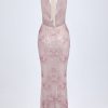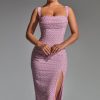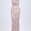 Sparkles for sunset. The Soleya maxi dress is crafted from stretchy and slinky 20D mesh, unlined for a barely-there feel, and adorned with signature HOTFIX embellishments arranged to resemble tropical-inspired flowers. Designed to drape effortlessly, it’s elevated with a low cowl neckline, statement thigh-high leg spit, and a low open back. It’s cut to a column silhouette with a puddle hem and framed with adjustable halter ties for your perfect level of support and coverage from golden hour to after dark.