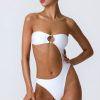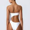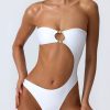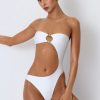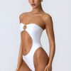 Master resort dressing. The perfect one-piece for beach club or beach days that turn into balmy evenings, this bandeau swimsuit is crafted from premium stretch-jersey swim fabric that sculpts and shapes your figure. It’s punctuated with a curved side cut-out and small bust cut-out, anchored with signature gold-tone shell hardware for a statement finish.
