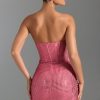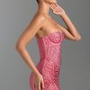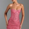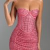 Scene-stealing silhouettes. Crafted from premium 20D mesh with a touch of stretch, the Azelie mini dress features a fitted bodice inspired by classic corsetry that cinches your silhouette. Framed with a sweetheart neck and moulded underwired cups, it falls to a mini-length skirt that’s precisely draped to create an asymmetric look and it’s saturated with scores of sparkling HOTFIX embellishments that glitter under the light.