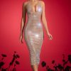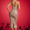 Designed for nights you’ll never forget, the Munira midaxi dress is saturated with scores of custom-designed diamond HOTFIX embellishments for endless sparkle. It’s crafted from stretch power mesh to a figure-hugging silhouette framed with a plunging neckline and crossover back straps that can be adjusted for a supportive fit.