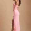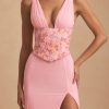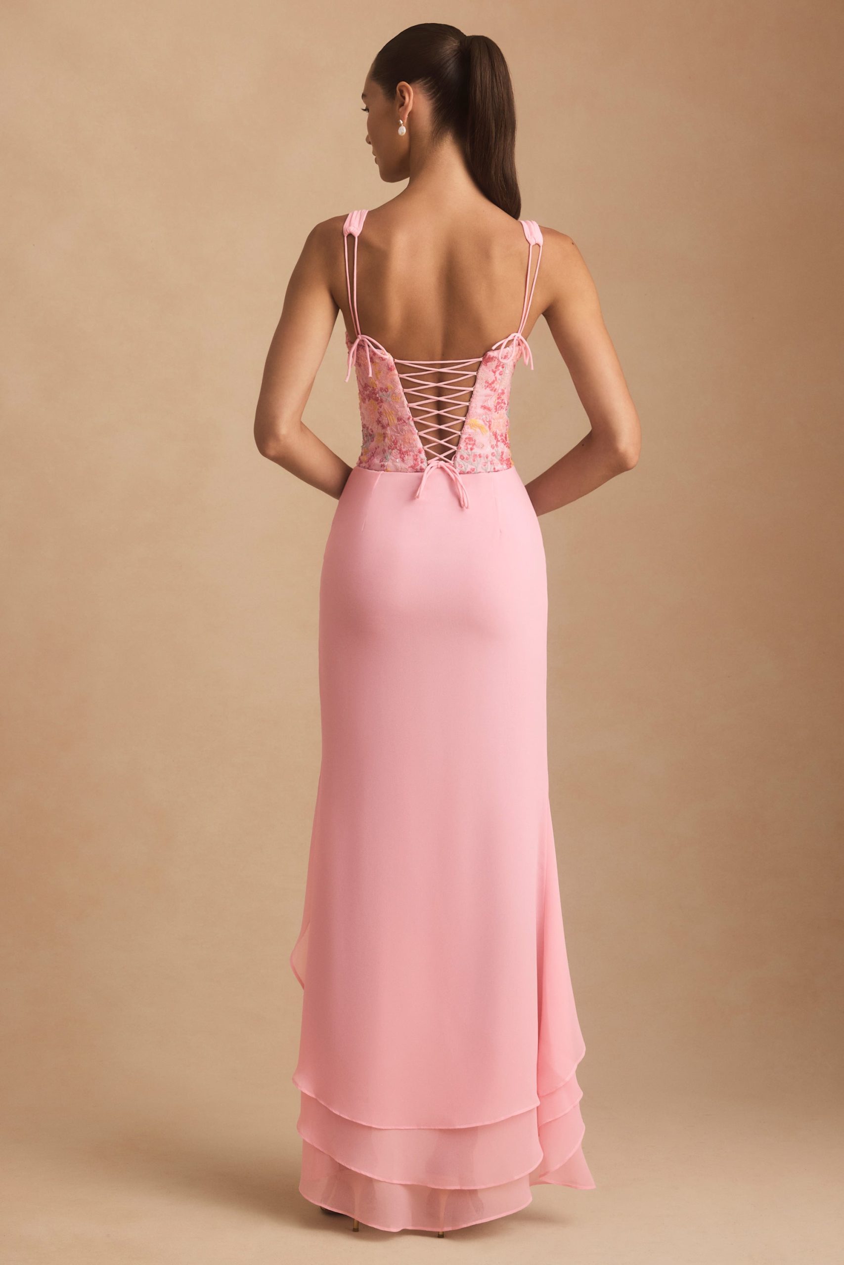 Worth making plans for, the Nathalia maxi dress is cut from lightweight chiffon with a plunging V-neckline, waterfall split hem and statement lace-up back. It’s overlaid with a waist-cinching corset decorated with coral-inspired embellishments that sparkle under spotlights. The rouleau straps are fully adjustable for your perfect fit.