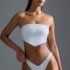 Swimwear that doubles as playful styling pieces. Ideal for navigating poolside days that turn into endless balmy evenings, this bandeau bikini top is crafted from soft-touch stretch-jersey swim fabric to an asymmetric scarf-inspired silhouette. It’s embellished with sparkling hotfix rhinestones and features adjustable ties at the back for a comfortable, custom fit.