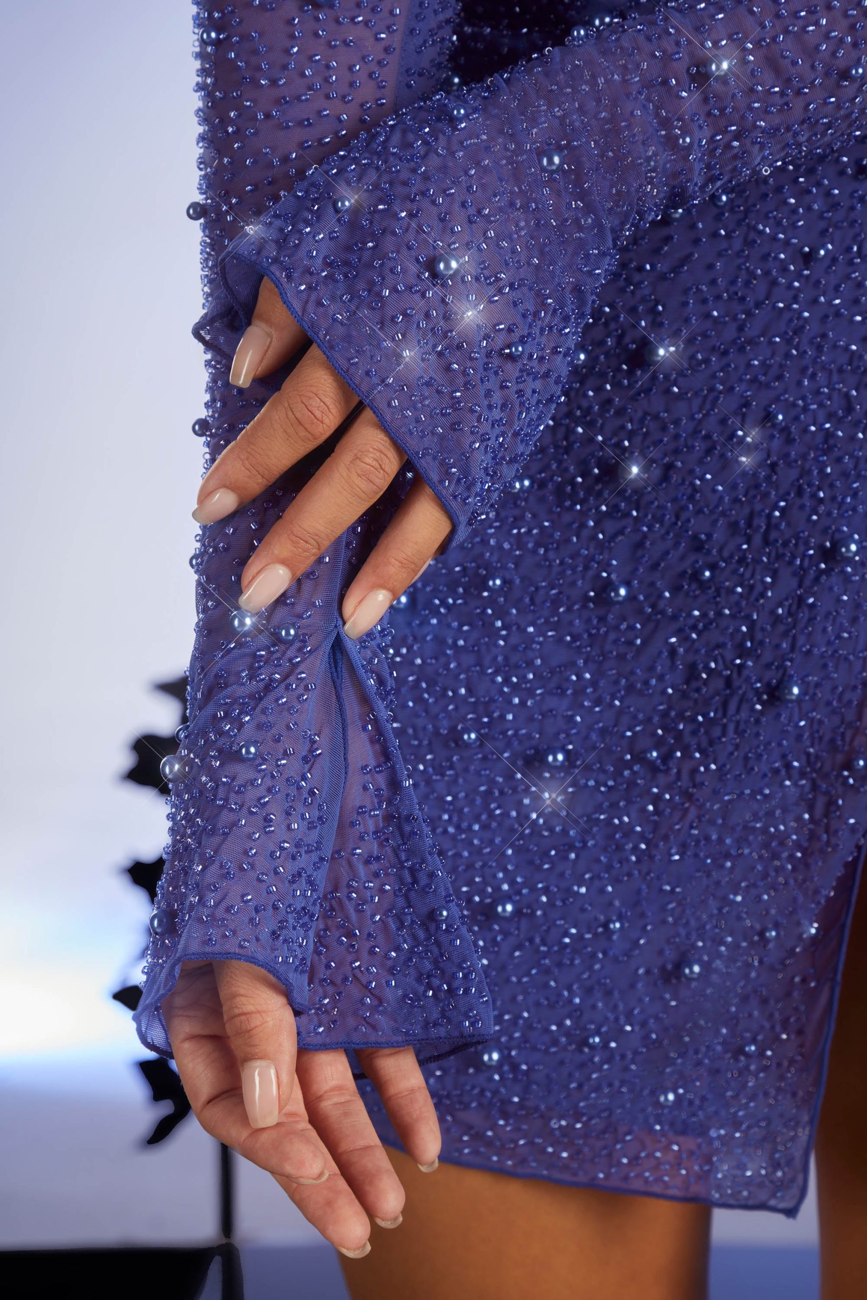 Designed with an undeniably flattering wrap over neckline that exposes a flirtatious amount of skin, the Chelsea mini dress features a heart stopping a-line skirt with full split that exposes your left leg. Fully embellished with pearl and bead adornment and complete with a semi sheer mini skirt and split flare sleeves, Chelsea is all about the finer details. Complete with a built in bodysuit, Chelsea is the ultimate party dress for your most premium events this season.