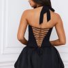 Playful silhouettes for memorable nights. The Ludmila mini dress is crafted from sumptuous georgette and satin to a structured bubble hem silhouette, complete with matching jersey shorts to temper the micro mini length. It’s framed with an adjustable halterneck for a supportive fit and is complete with corset-inspired lace-up detailing at the back.