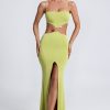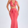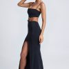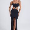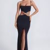 Striking silhouettes elevated with custom-developed hardware. Inspired by the sleek look of separates, the Julitta gown comprises a cropped bodice and maxi-length skirt secured with gemstone-embellished hardware at the center. It’s cut from premium sandwashed jersey with a touch of stretch and is complete with adjustable camisole straps for a customized fit.