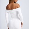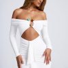 Sultry and striking. The perfect complement to sunset dinner plans, the Saffron mini dress is crafted from lightweight textured jersey to a bodycon silhouette, elevated with cascading ruffle trims that extend from the cut-out at the waist. It’s framed with draped off-shoulder sleeves and anchored with custom-developed hardware, tipped with two contrasting gemstones.