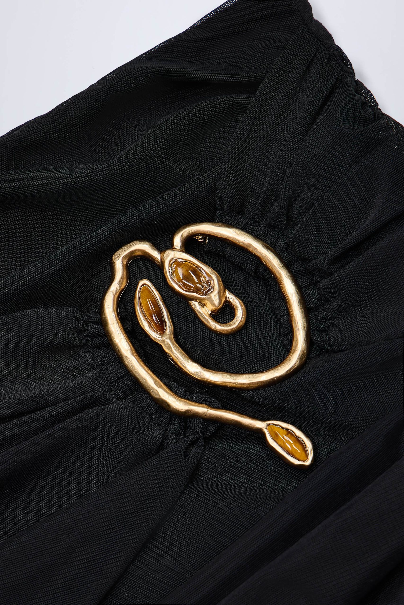 Your resort wardrobe? Upgraded. Go from day to night on the island with the Tobago mini skirt, crafted from lightweight, airy and figure-hugging premium mesh. Cut to a mid-rise silhouette for a figure-skimming fit, it’s elevated with HOTFIX embellishments, ruffle trims and custom-designed gold-tone hardware for a statement finish.