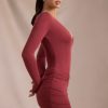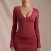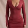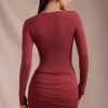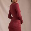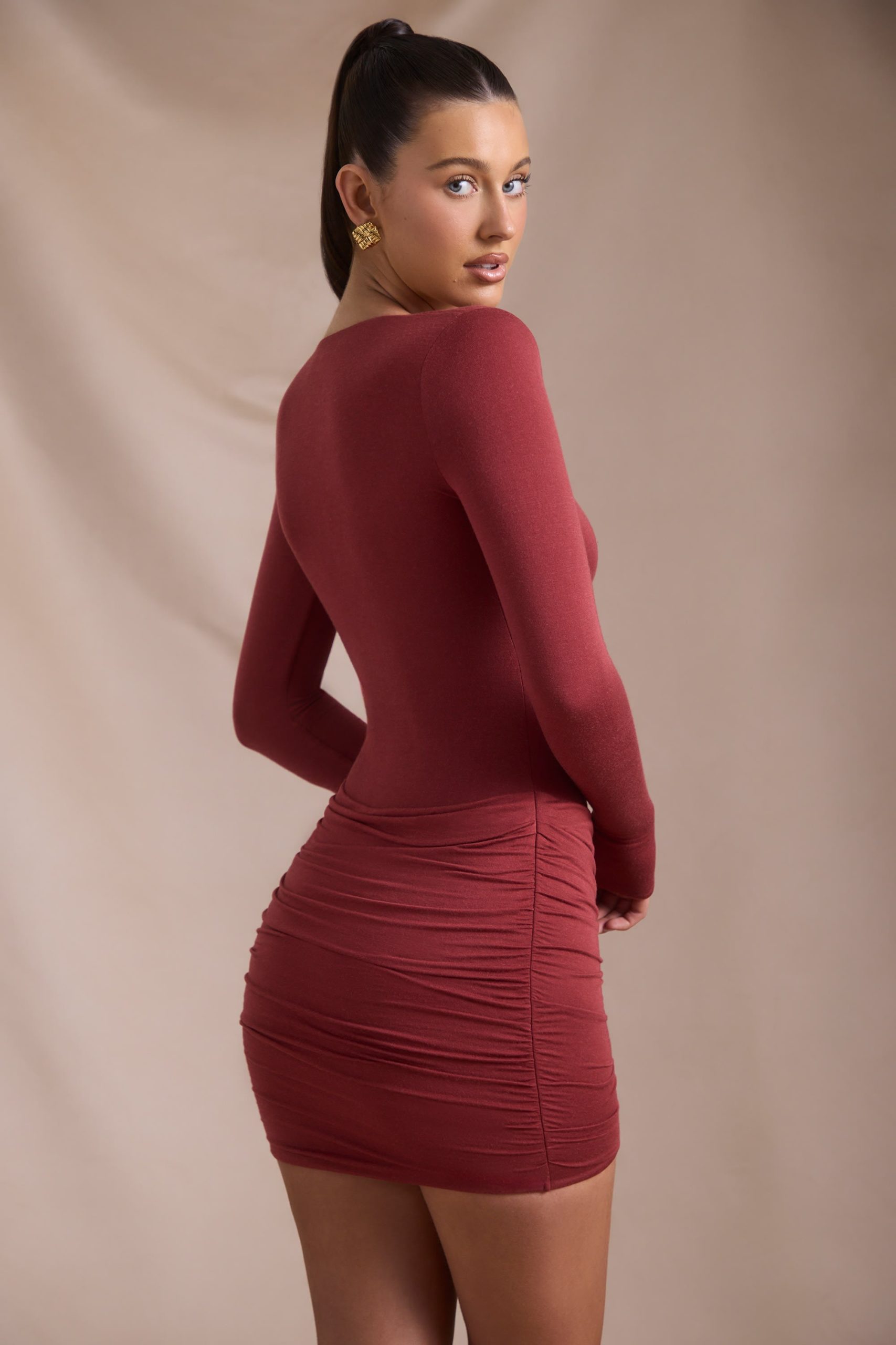 Modal-Cashmere Blend Draped Long-Sleeve Mini Dress in Brick Red