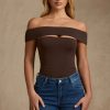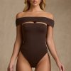 Elevated minimalism. A fresh take on classic off-shoulder styles, this bodysuit features a bandeau neckline with a cut-out design at the front, perfect for adding interest to smart-casual looks. It’s crafted from buttery soft, stretchy and breathable jersey made with TENCEL™ Modal fibres, derived from controlled or certified wood sources. It’s designed for a figure-hugging fit and elevated with ruched side seams for enhanced comfort.