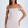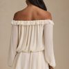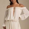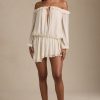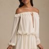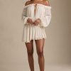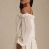 Spring moments, elevated. Lightweight and breezy, the Solana mini dress is crafted from premium chiffon to a relaxed off-shoulder silhouette with oversized balloon sleeves. It features an elasticated waist, plunge keyhole cut-out at the front and an asymmetric tiered skirt. The neckline is traced with pretty ruffles and features functional lace-up ties for a custom look.