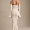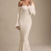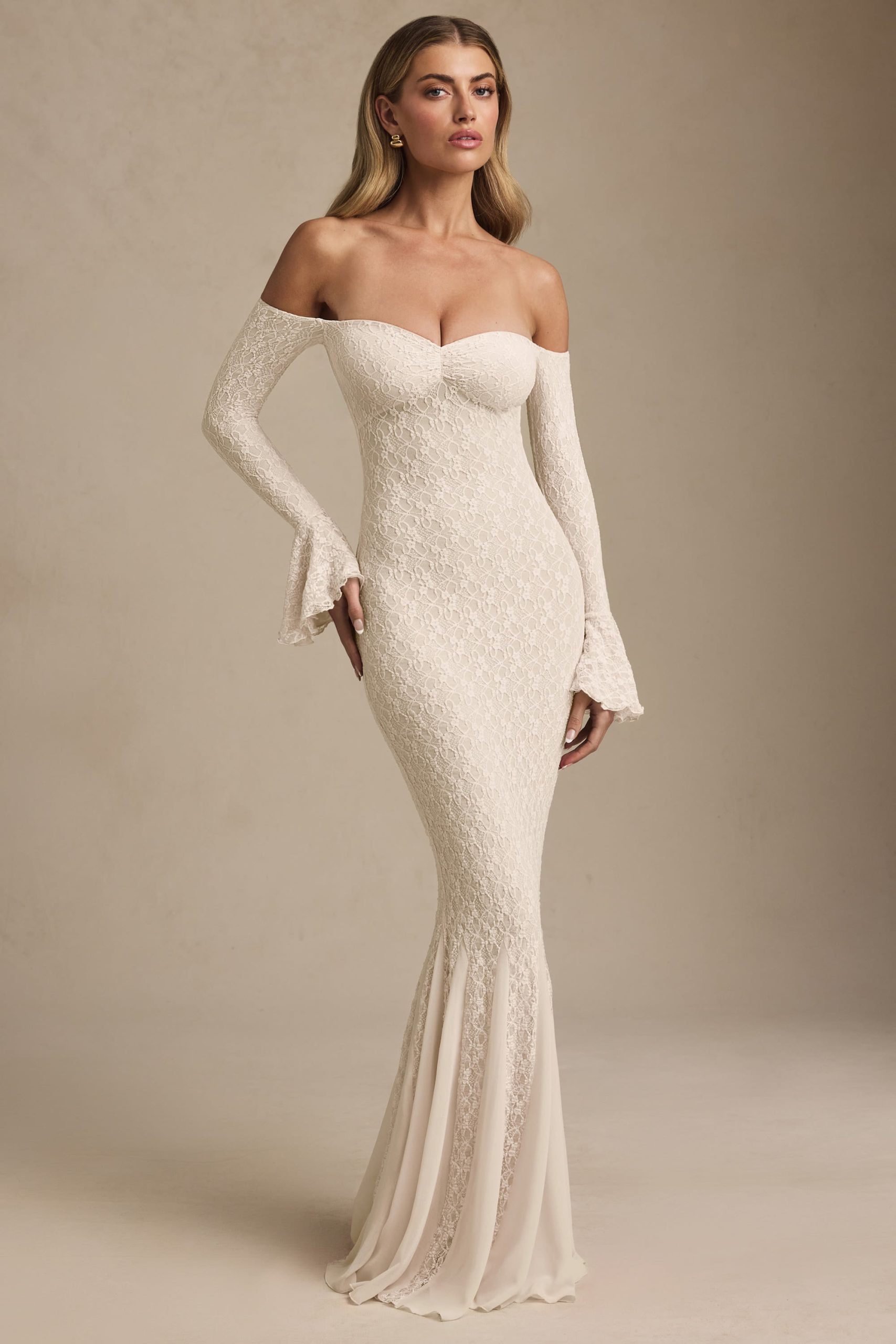 Romantic silhouettes, best served under the sun. Crafted from premium stretch lace with a soft, sheer jersey lining, the Verena maxi dress is cut to a figure-hugging fishtail silhouette. It’s framed with an off-shoulder sweetheart neckline and long fitted sleeves with delicate ruffled cuffs. The contrasting godet pleats create stunning movement with every step.