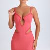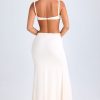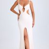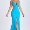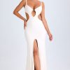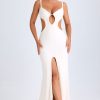 Ultimate holiday looks. Designed with tropical getaways in mind, the Selenia maxi dress is crafted from premium 20D stretch mesh with a lightweight slinky jersey lining for enhanced coverage. Punctuated with contouring waist cut-outs and an open-back, it’s traced with delicate ruffle appliqués and is complete with a statement thigh-high front split.