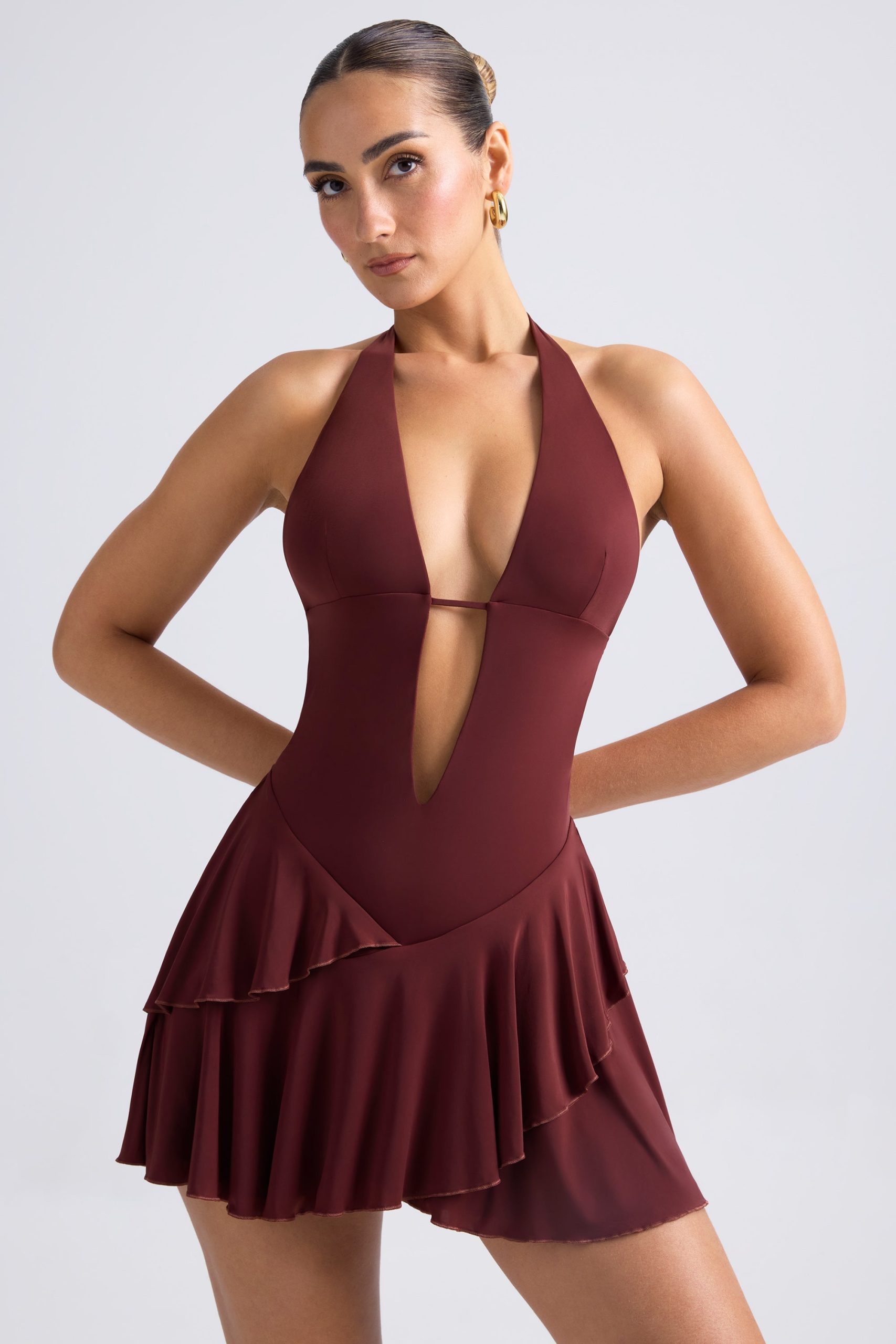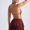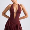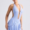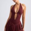 Striking silhouettes. Designed to make an impact, the Chimere mini dress is cut from our premium sheer jersey to a halterneck, A-line silhouette and enhanced with a tiered, ruffled mini skirt. Its punctuated with cut-out detailing at the front and an open back secured with a slender adjustable strap for your perfect fit.