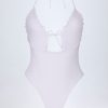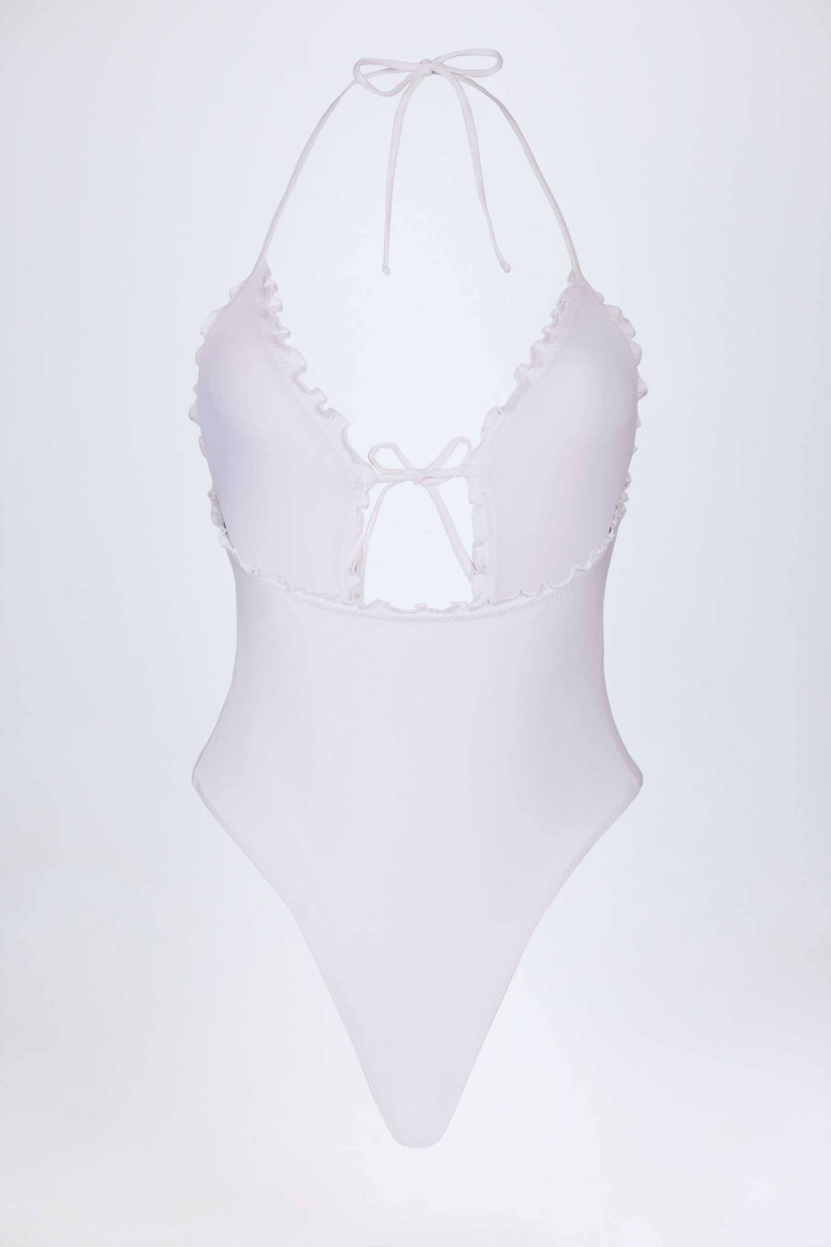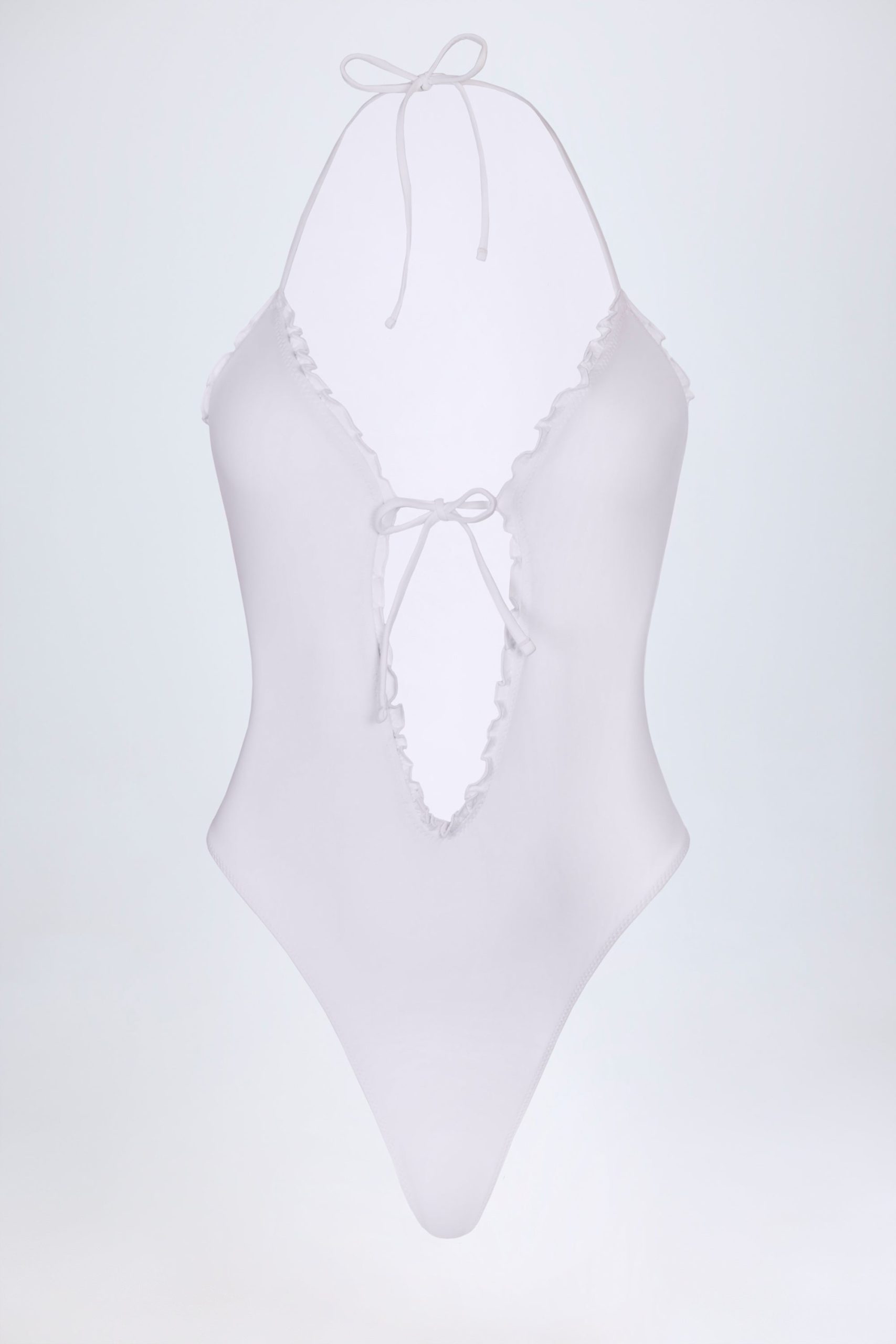 The sweet life. Embrace beach days and summer trips with the Montjoi swimsuit, crafted from our signature stretch-jersey swim fabric for a figure-defining fit that flatters all shapes. It’s elevated with a halterneck tie and a ruffle-trimmed plunge neckline anchored with a bow.
