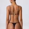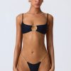 One for your next girls’ trip. A statement design that’s sure to turn heads when paired with the coordinating bottoms, this bikini top is elevated with a cut-out at the bust anchored with gold-tone chain hardware and cut-out detailing at the back. It’s crafted from premium stretch-jersey swim fabric and framed with slender adjustable shoulder straps for a supportive fit.