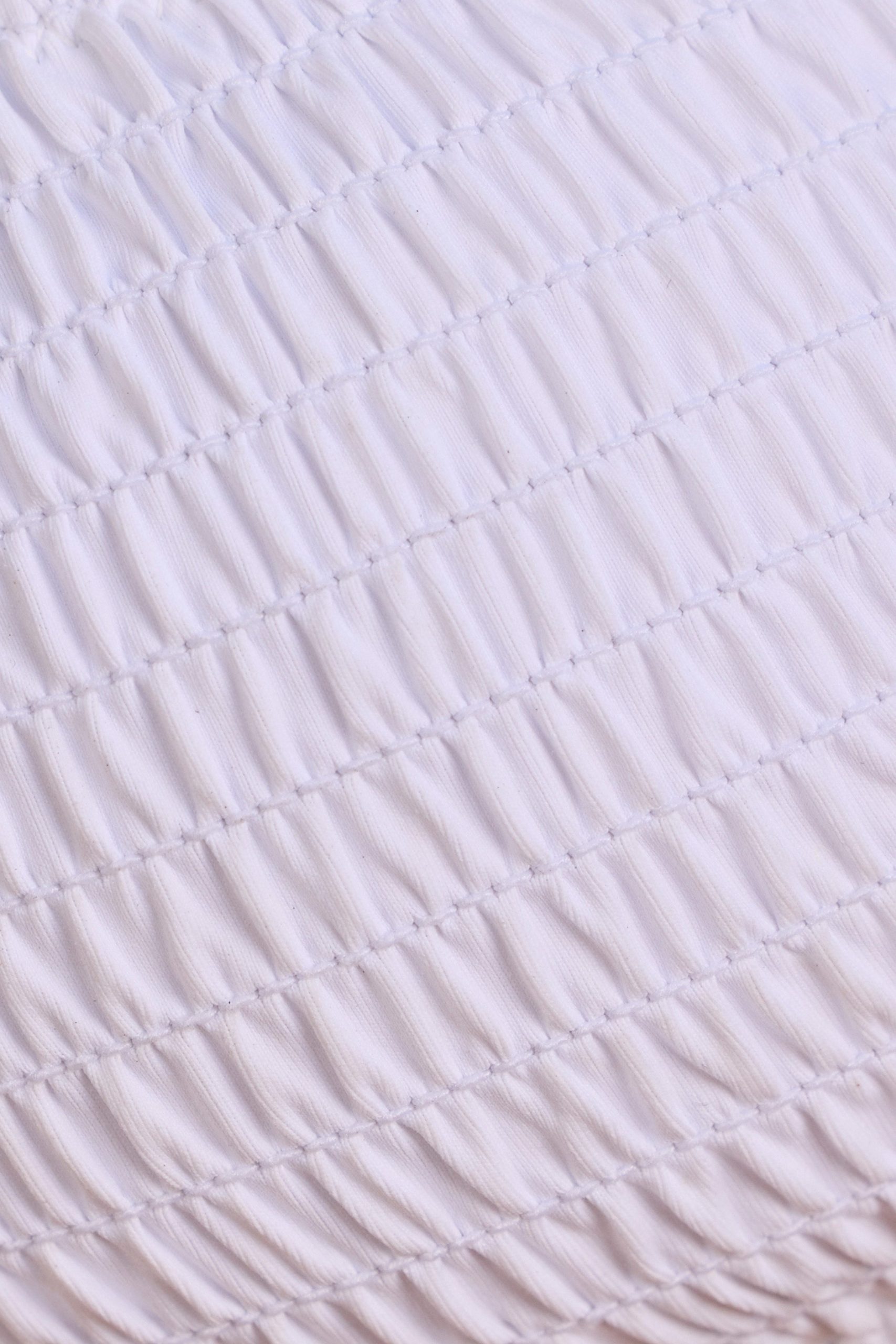 Endless days under the sun. Designed in our premium crinkle fabric in five pastel hues, this bandeau bikini top is a flattering and feminine swimwear staple with delicate frilled edges. Multiwear in design, the Crinkle Swim strappy bikini top is complete with self tie straps and side boning for a supportive fit.